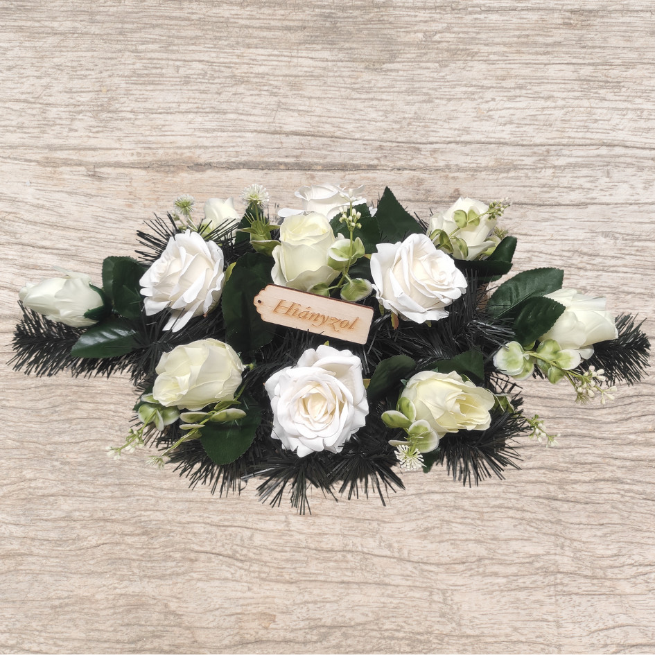 Gondosan készített, tartós selyem koszorú, amely hosszú ideig megőrzi szépségét és méltó dísze lesz szerettei nyughelyének.